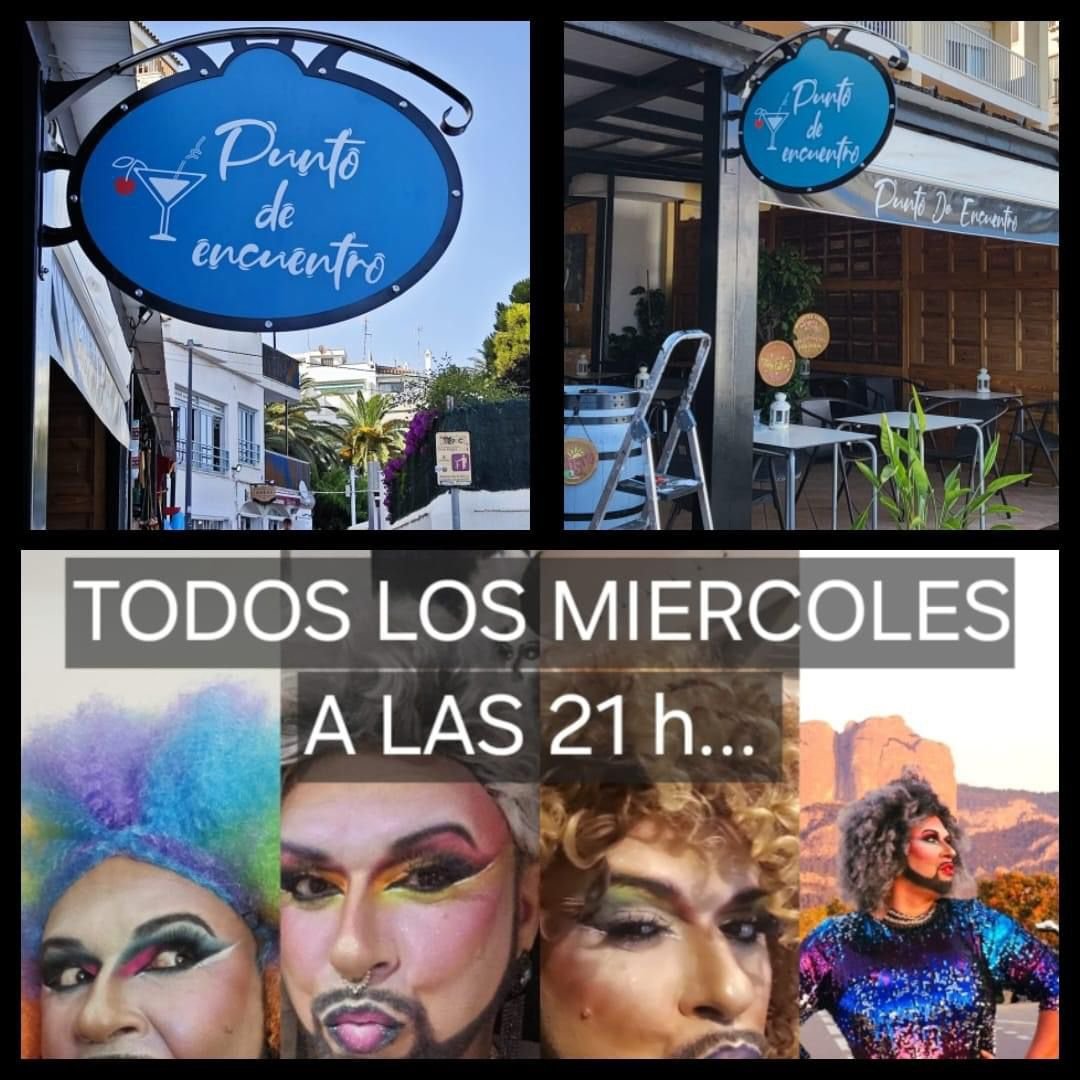 En la terraza del Bar Punto de Encuentro, al caer la noche de los miércoles, el espectáculo DRAG de la zona.