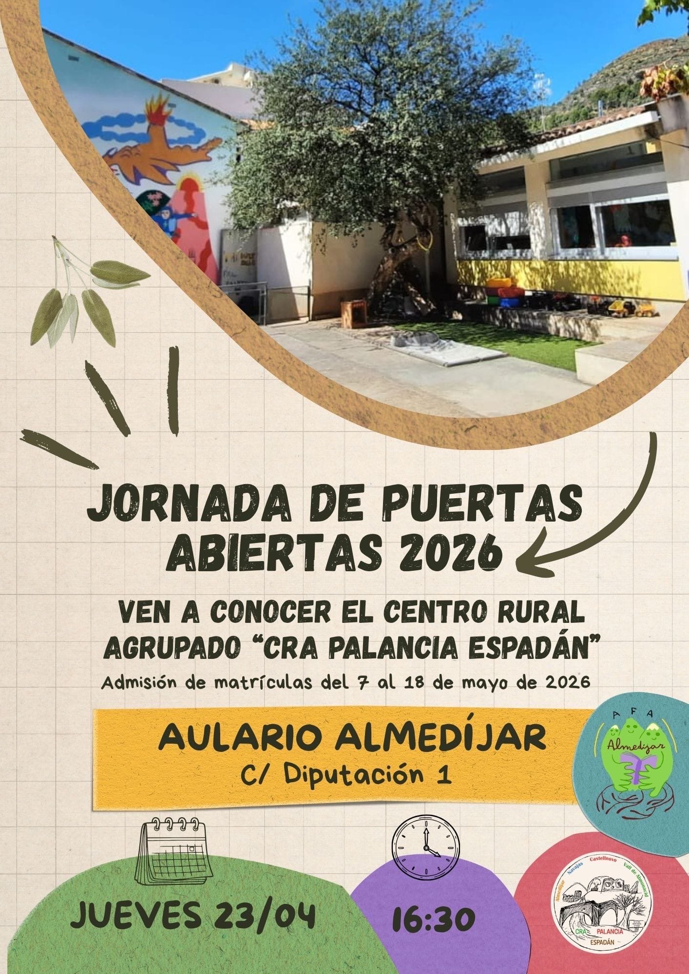 El aulario de Almedíjar pertenece al Centro Rural Agrupado «CRA Palancia Espadán». La reapertura de la escuela se hizo realidad gracias a la iniciativa vecinal «Almedíjar Vive» que se movilizó por repoblar el pueblo, junto con el equipo del CRA.