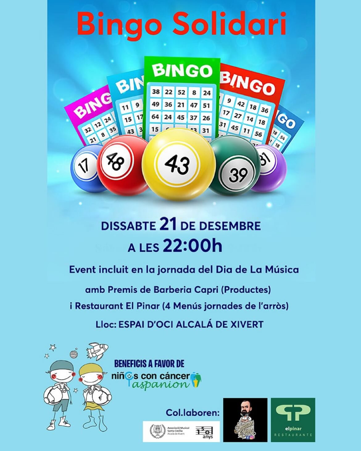 L'Associació Musical Santa Cecilia d'Alcalà de Xivert, vos espera a tots i totes per gaudir d’un dia molt musical amb familiars i amics. Comencem amb paelles, seguim amb tardeo per la vesprada i acabem el dia amb concert i festa, amb jocs pels més menuts i un bingo solidari